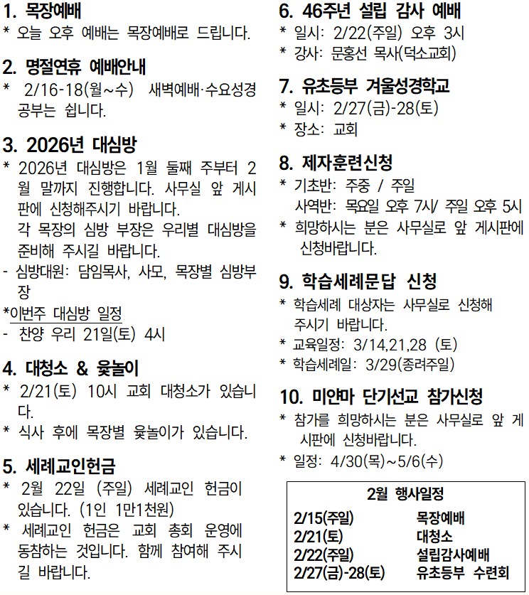 26년 2월 15일 교회소식