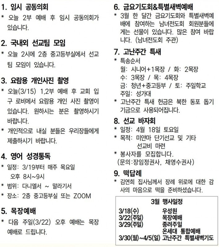 26년 3월 15일 교회소식