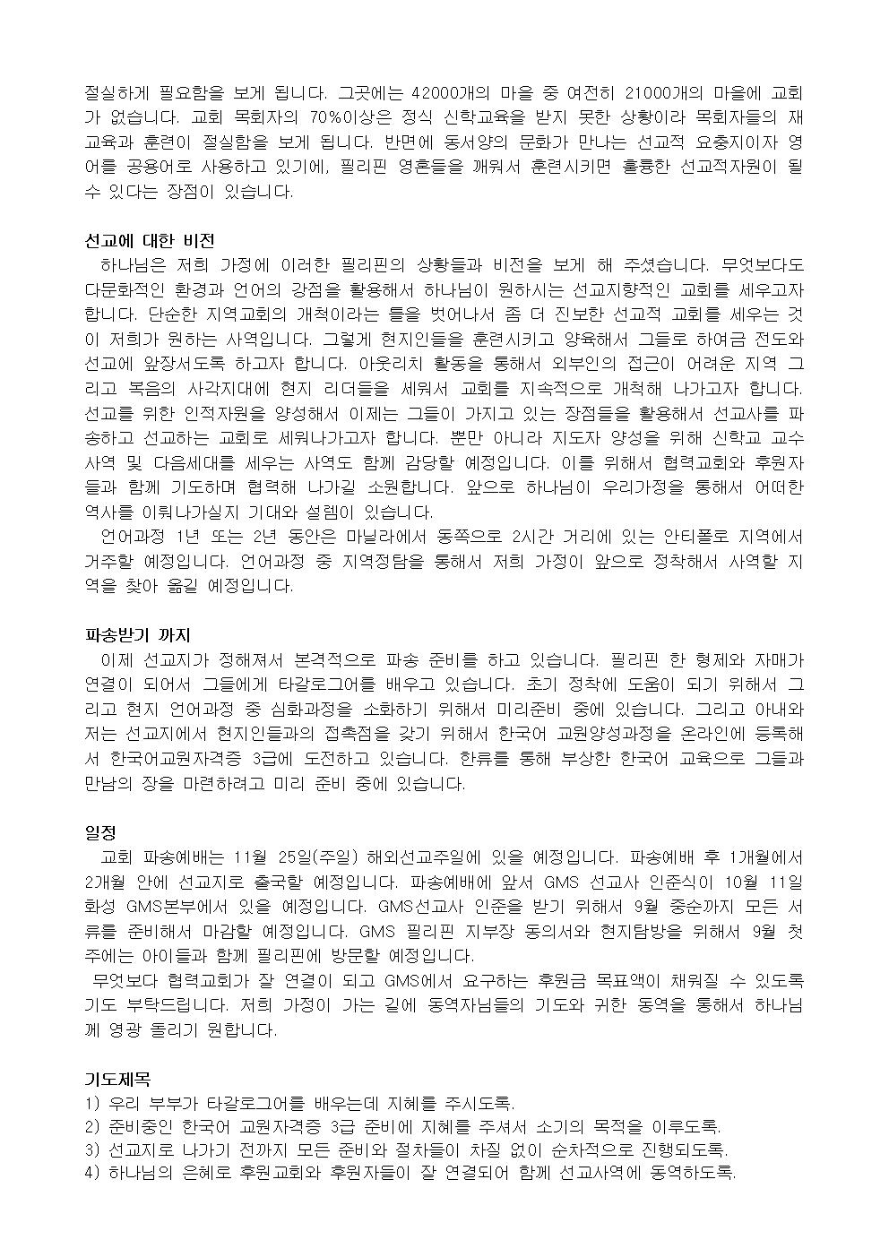 그동안 저희 가정이 앞으로 섬기게 될 선교지가 확정되어지지 않아서 기도편지를 미루고 있었습니다. 그러던 중 6월 24일 주일에 파송교회에서 저희가정을 필리핀으로 파송하기로 결정하고, 이제 11월 25일(주일)에 파송예배를 드리는 것으로 하고 준비하는 가운데 있습니다. 이에 귀한 기도 동역자님들과 함께 저희 가정의 소식을 나누고자 기도편지를 보내 드립니다.