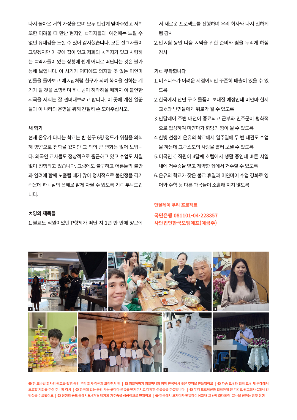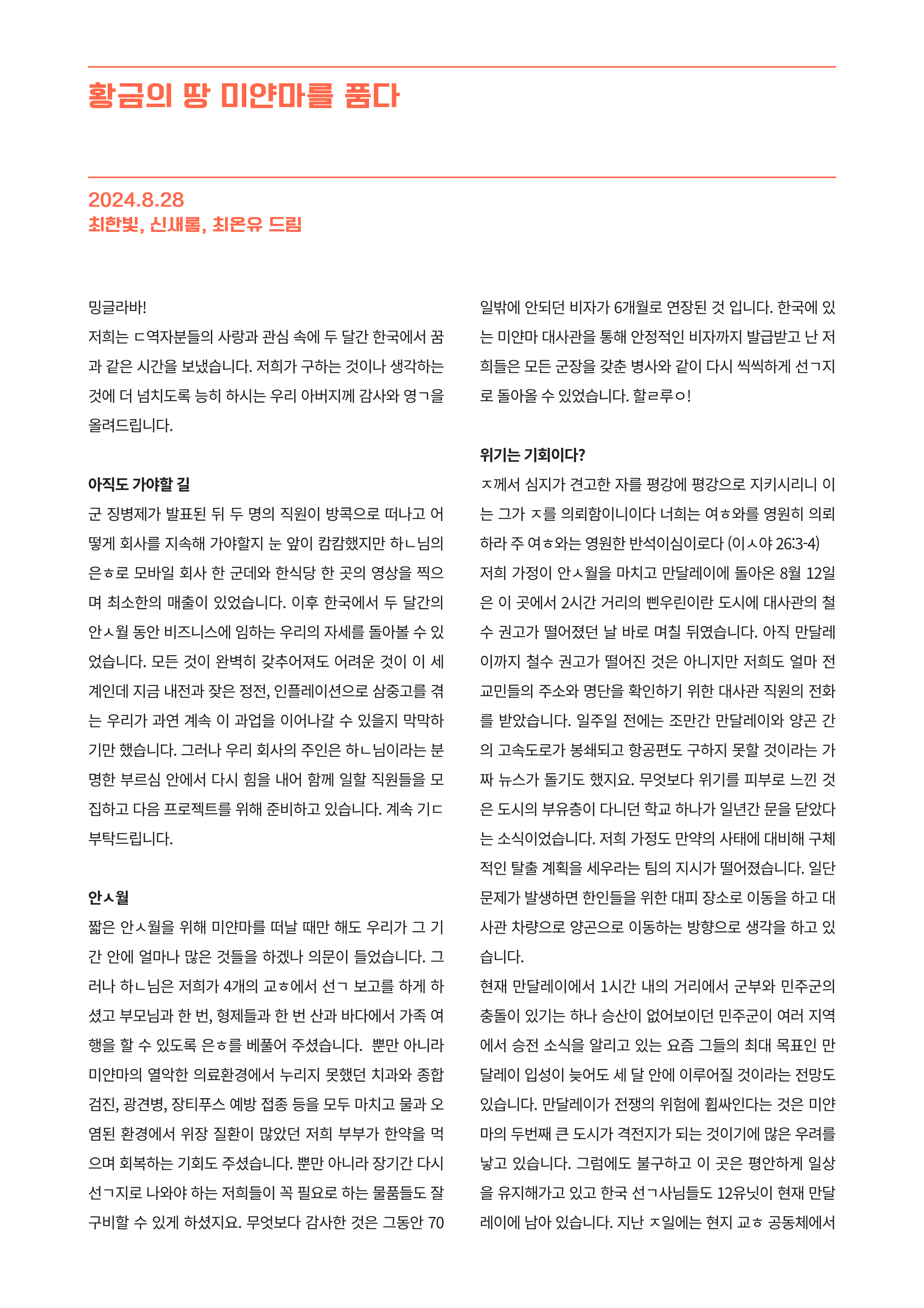 미얀마 최한빛 신새롬 선교사님 선교편지 240828