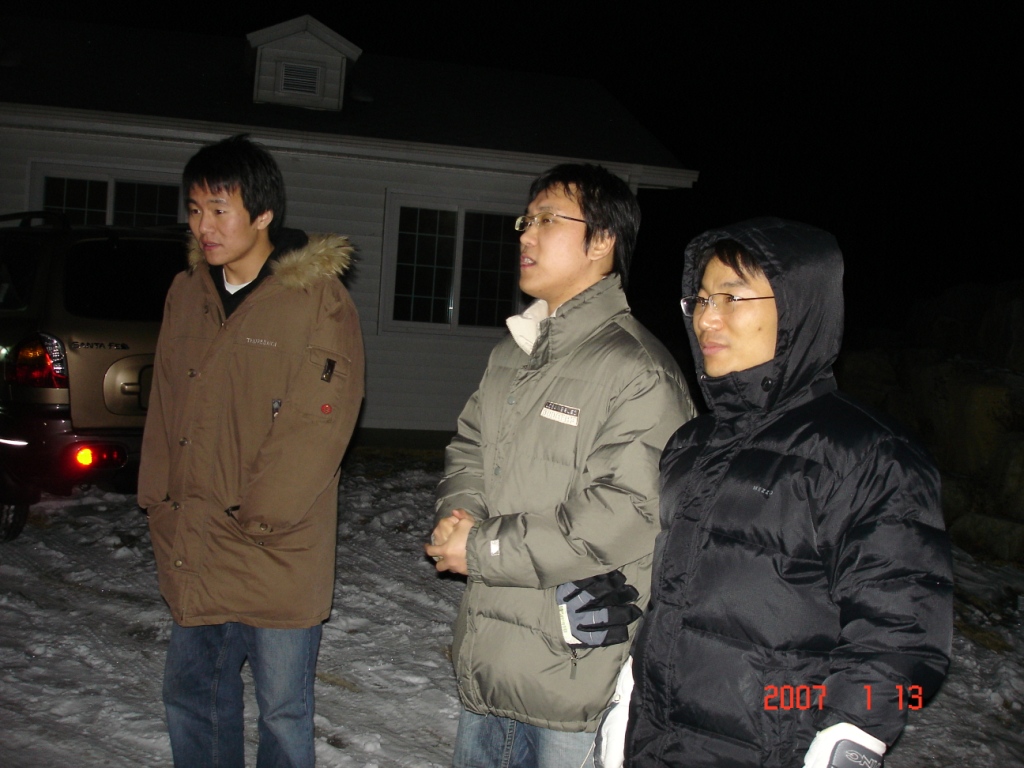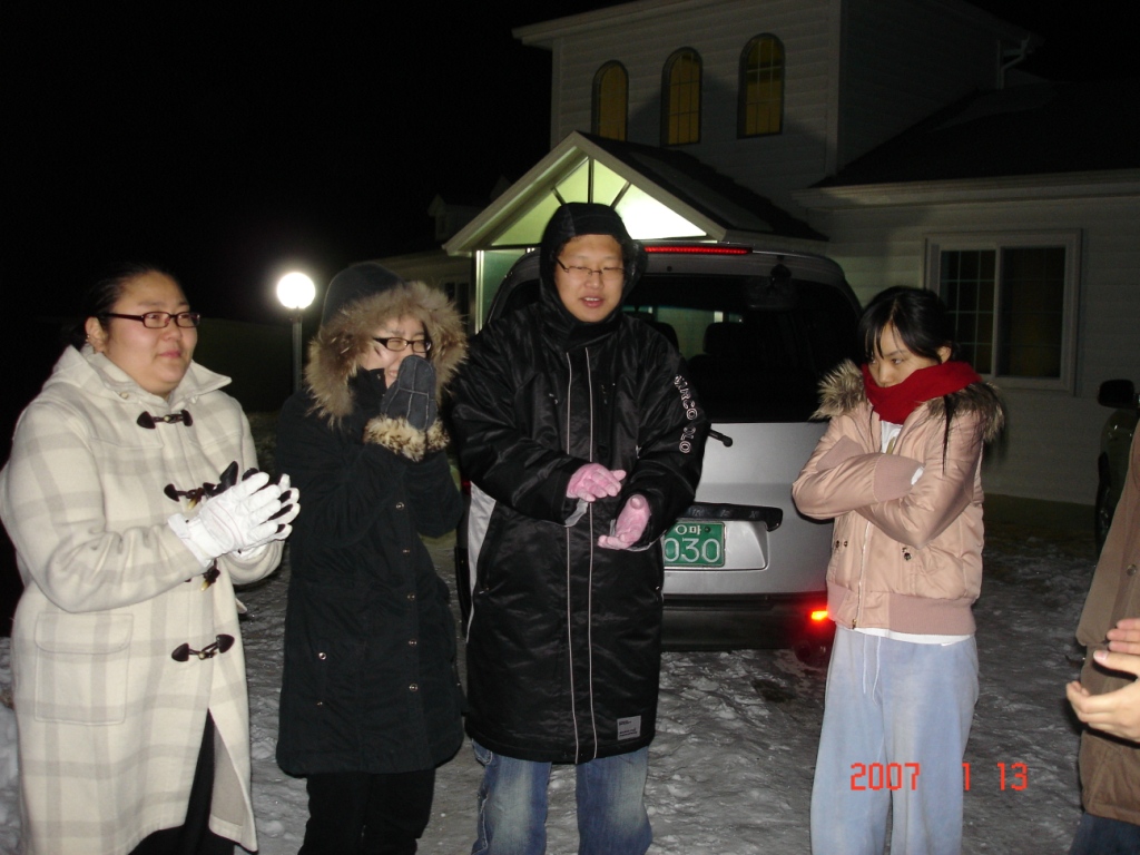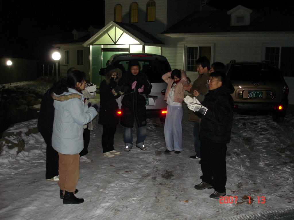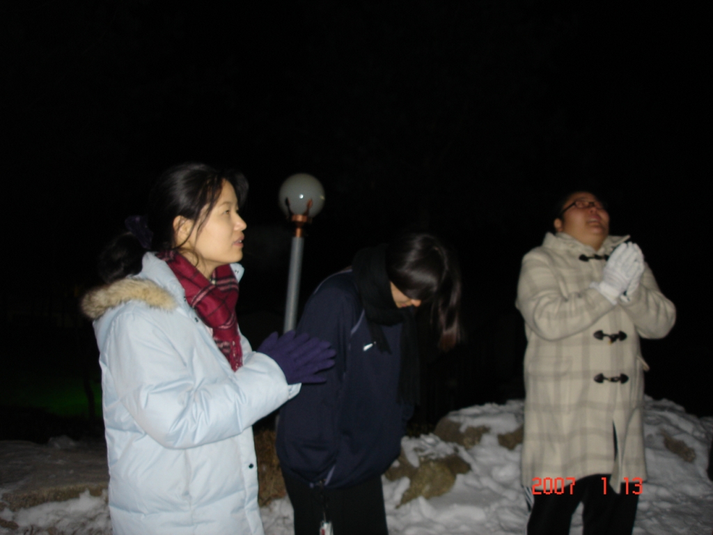 2007년 동계수련회중 산기도에 앞서서 모여서 기도...
